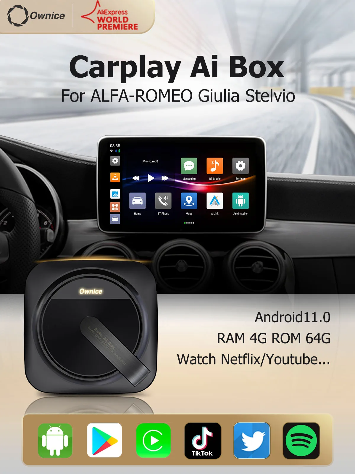 - Ownice-adaptador inalámbrico A1 A3 carplay con Android 11, adaptador de transmisión Multimedia, SMART TV, para ALFA-ROMEO, Giulia, Stelvio