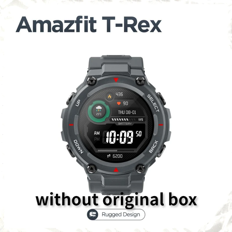 - Amazfit-reloj inteligente t-rex, dispositivo resistente al agua hasta 50 metros, con 14 modos deportivos, llamadas por Bluetooth y control del ritmo cardíaco, versión Global