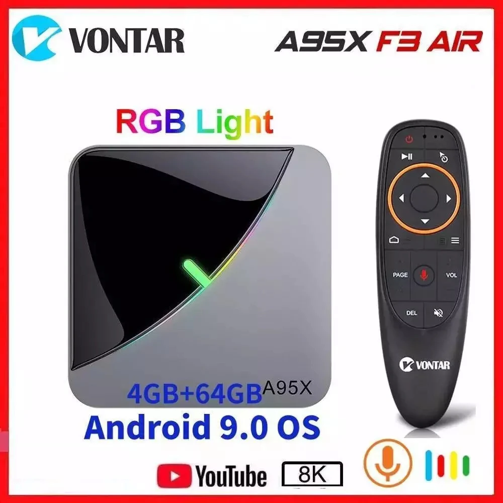 - VONTAR-Dispositivo de TV inteligente A95X F3 Air, decodificador con luz RGB 8K, Android 9, Amlogic S905X3, 4GB, 64GB, Wifi, 4K, A95XF3