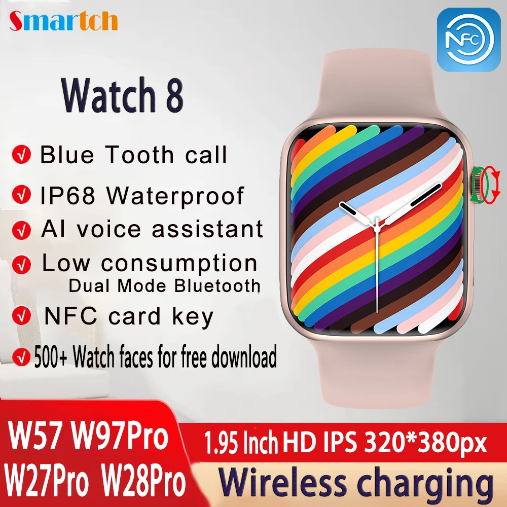 - Reloj inteligente Serie 8, 7, W57, W97, W27, W28 Pro, NFC, resistente al agua, BT, llamadas, Monitor de ritmo cardíaco, para Apple y Android