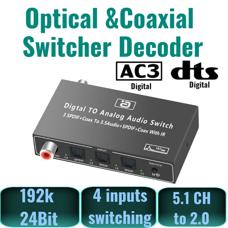 - Conmutador de Audio 4*3 24bit 192K 5,1 ch a RCA 3,5 MM 2CH DAC decodificador convertidor con control remoto IR para Smart TV ordenador consola de juegos DVD